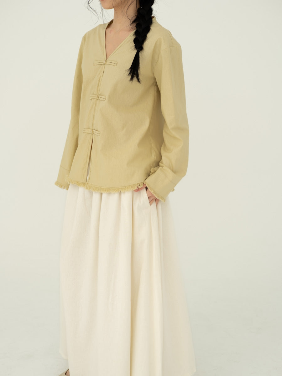 A flowy linen blouse with modern mandarin button and fringe detail.