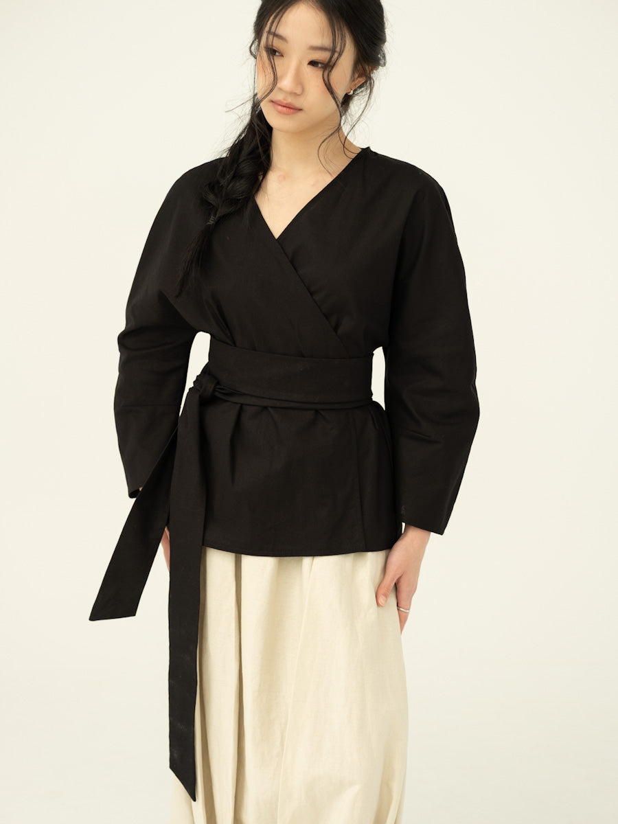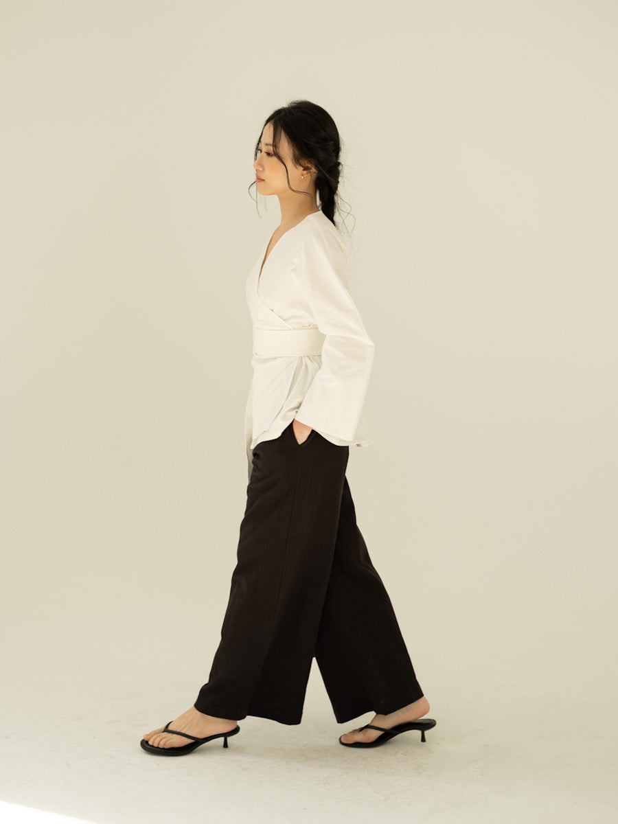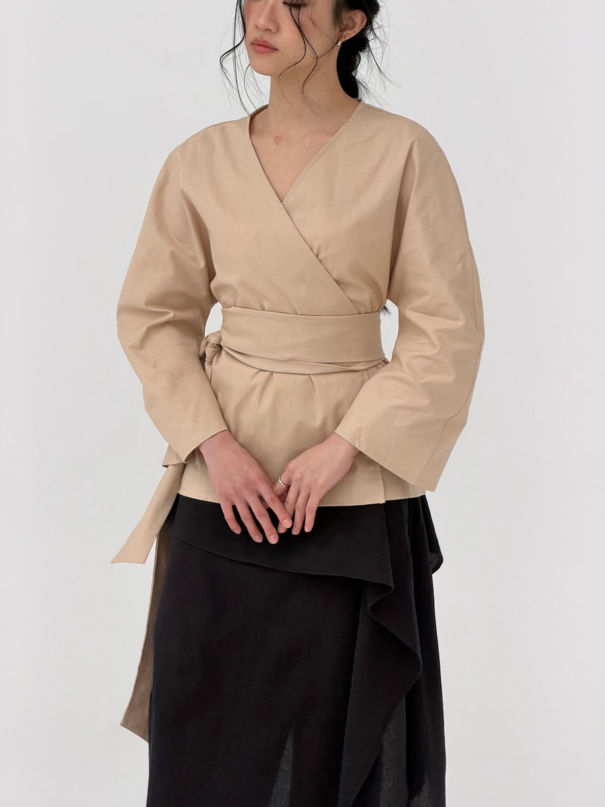 Wrap blouse with curve sleeve detail. Style it with Swan Skirt for a luncheon or any pair of trousers for daily ease look.