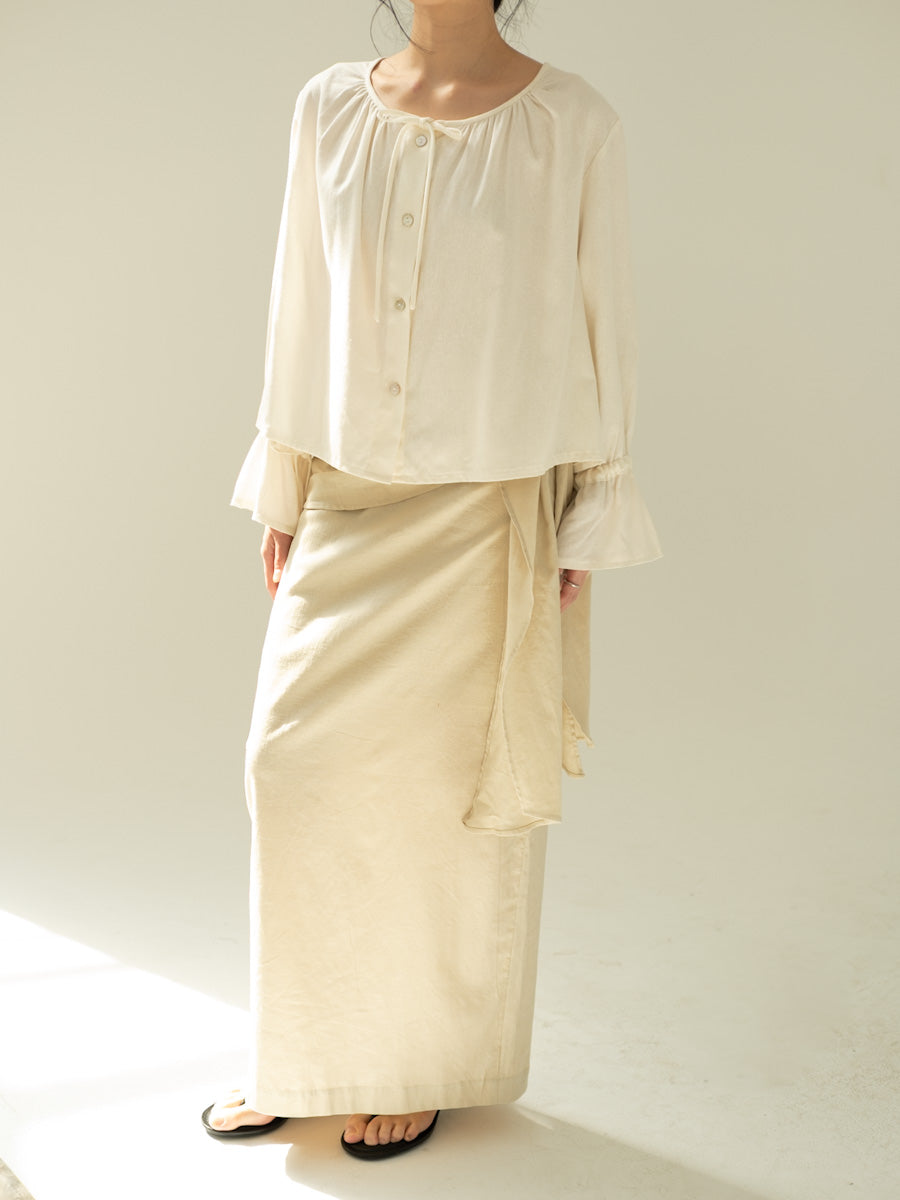 A flowy linen blouse with delicate ribbon details on the front and sleeves.